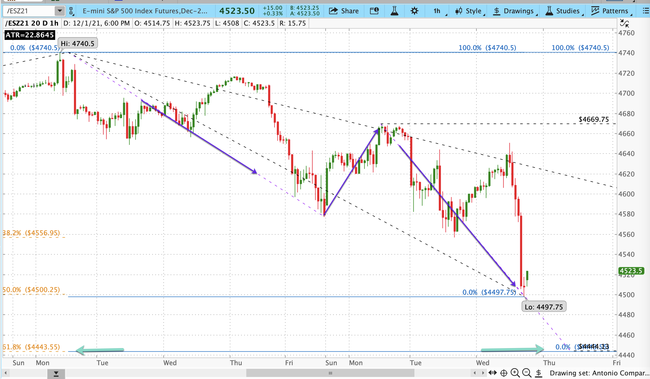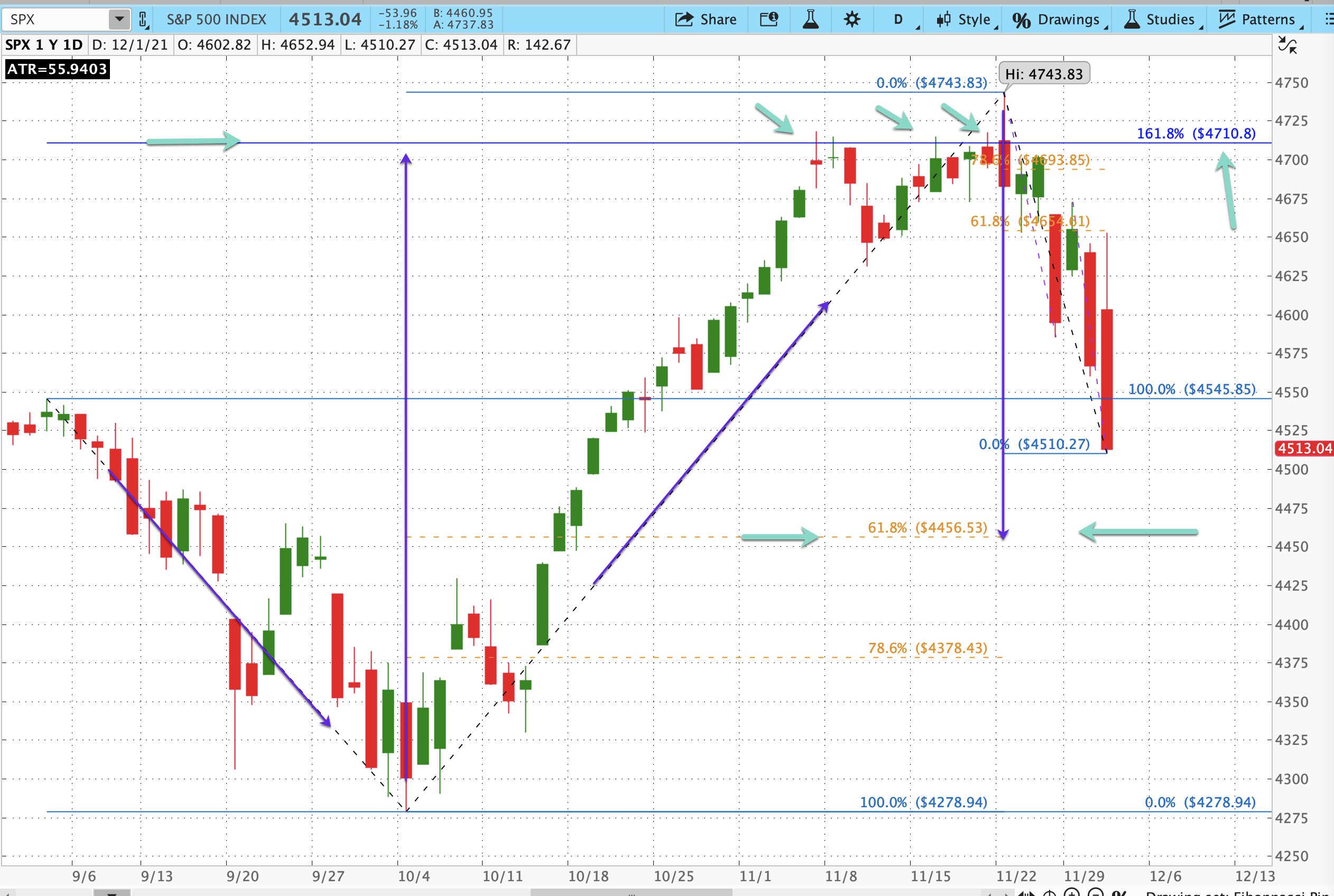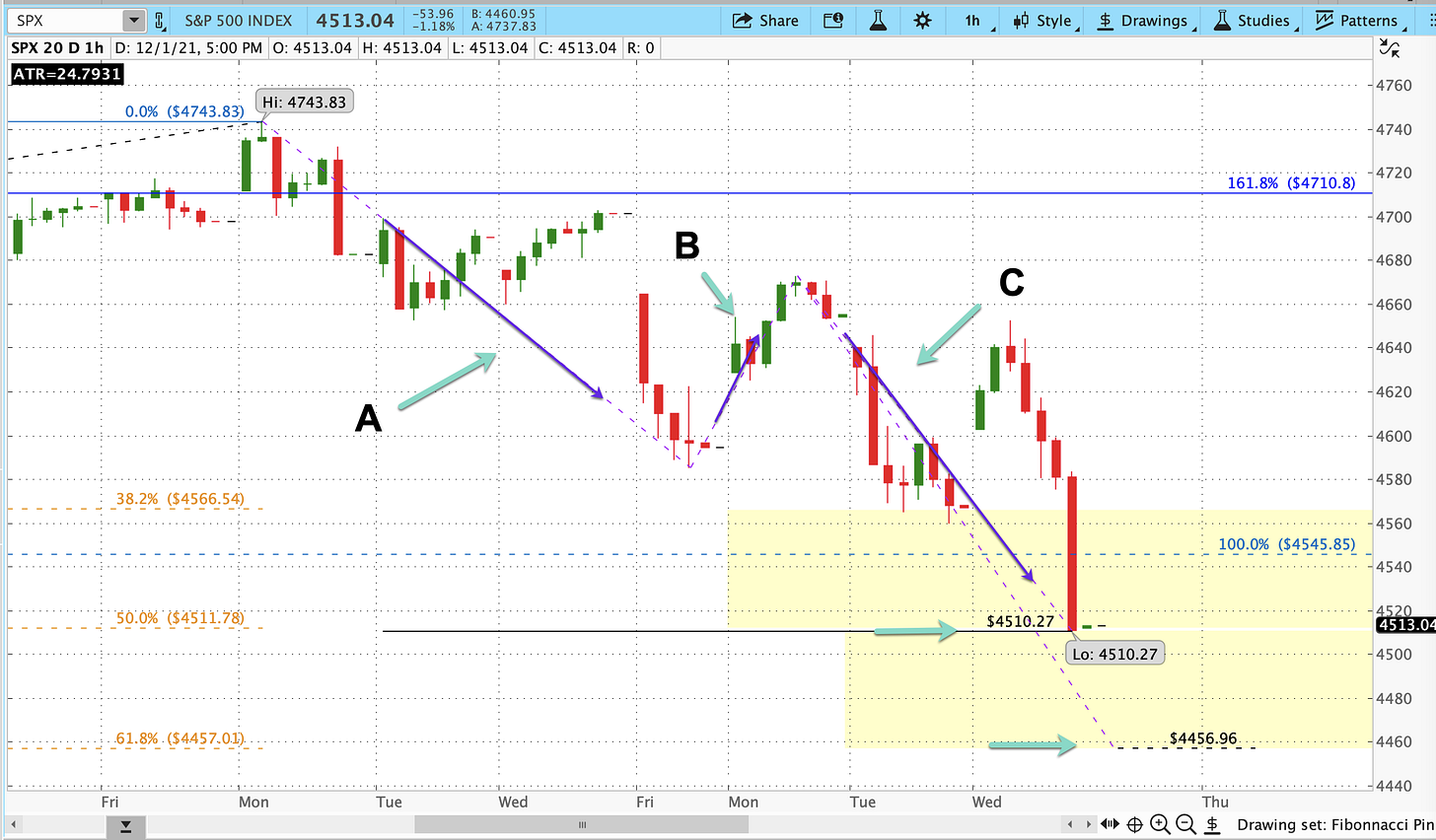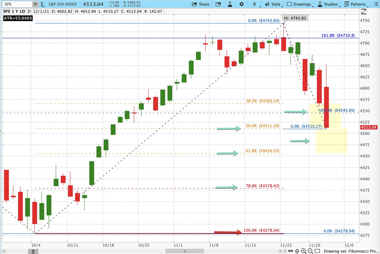 That suggests the next segment to watch for C is between today’s Low and 4444.13, almost exactly the 61.8% retrace of the move up from 10/1-11/22.