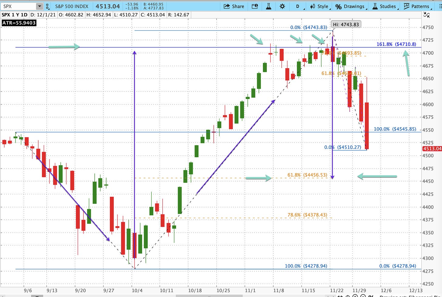 The move up above 4545.85 triggered a classic pattern where, after a price decline and a bounce back to a former high, price continues higher to reach the 1.61% extension of the retrace to the former high. SPX reached that extension, 4710.8, on 11/5, and over the subsequent weeks tried - and failed - to close above it. As projected last week, it’s now likely to retrace 61% of the rally up from 4278.94, just as it extended 61% above the old ATH.